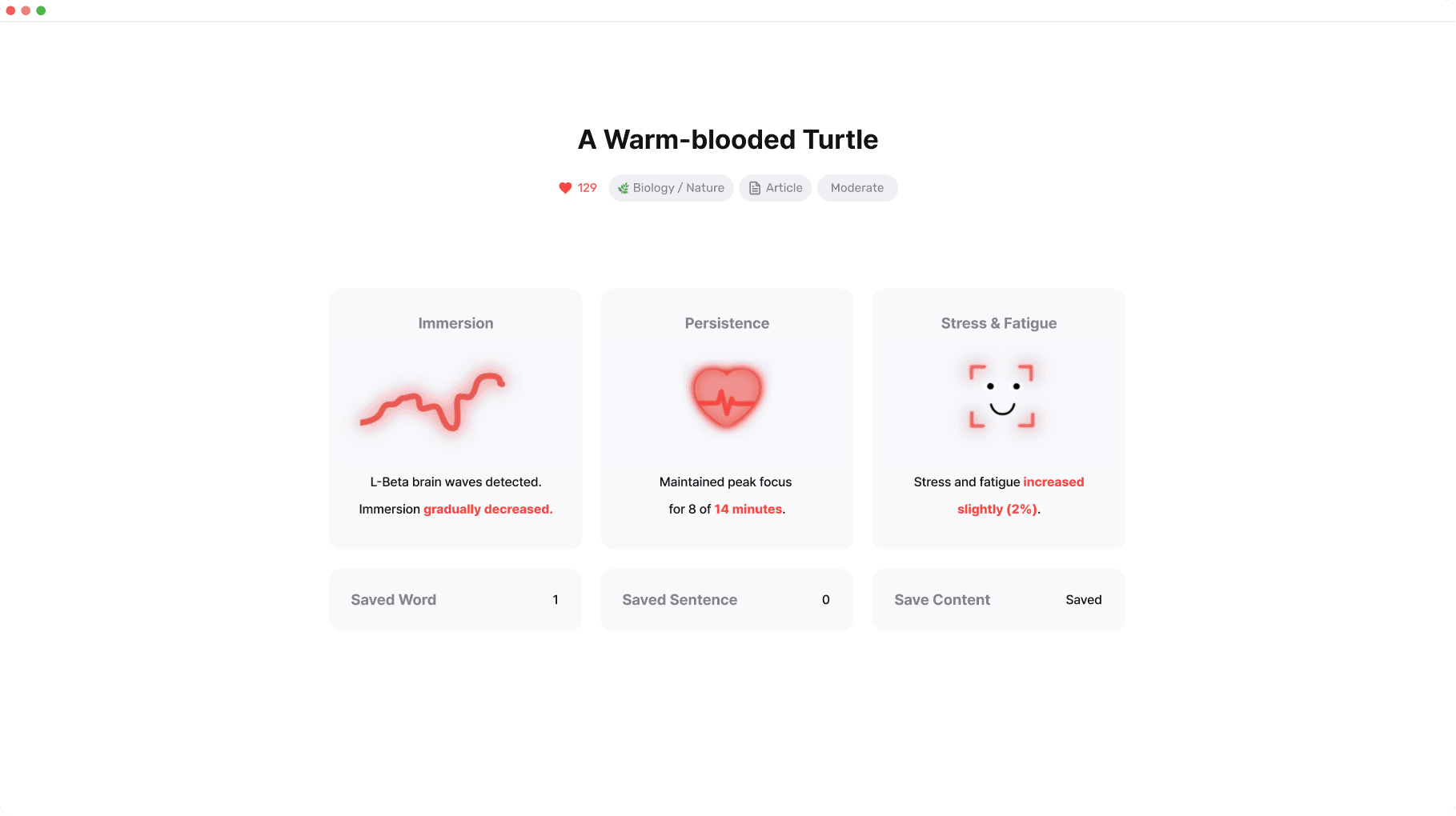 Understanding how you learn is just as important as what you learn. The post-session report visualizes invisible metrics like brainwave stability and stress spikes, empowering users to recognize their limits and build healthier, long-term study habits.