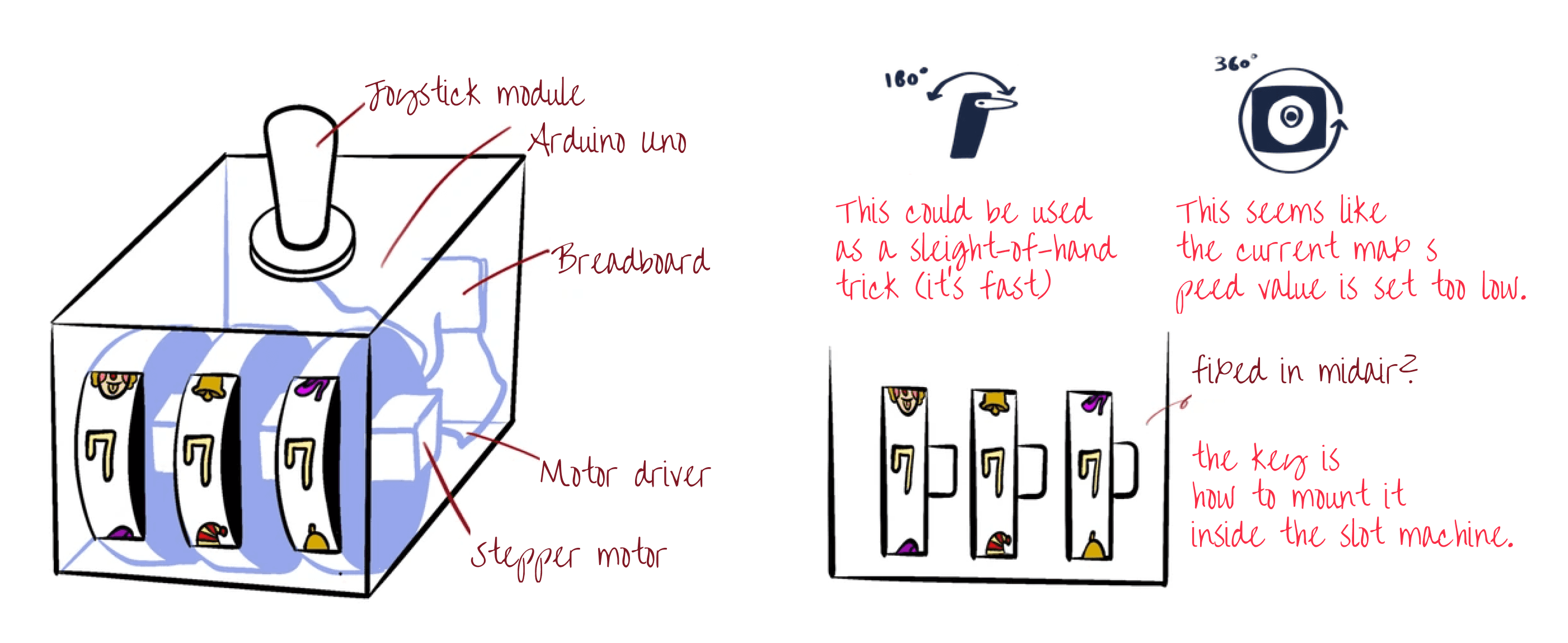 Sketching was the point where the idea became physical. I translated the iconic pull of a slot machine into components—lever input, rotational reels, and internal control—mapping how a single gesture would trigger a guaranteed outcome. Rather than aiming for a final design, these sketches helped surface practical questions: motor speed, mounting methods, and how to hide mechanical certainty behind the appearance of chance. The focus shifted from form to feasibility, using drawing as a way to think through interaction, structure, and control simultaneously.