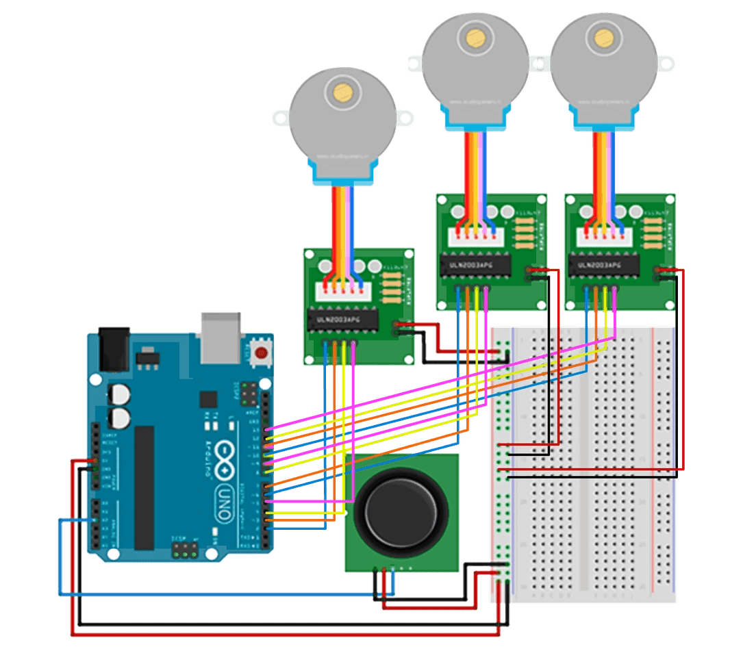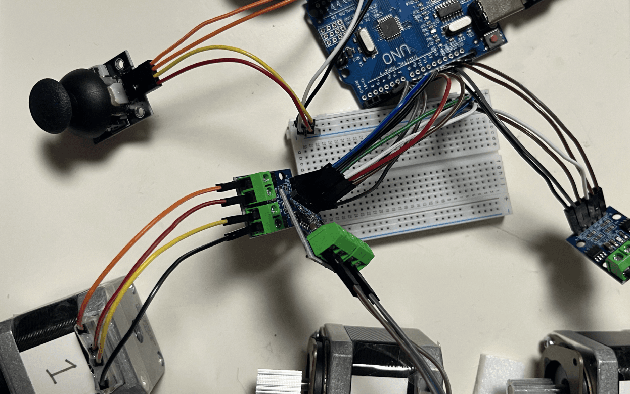 Here’s how the wiring is laid out. The Lucky Box runs on a simple input-to-motion loop: a joystick provides the user’s command, which the Arduino Uno interprets and converts into step pulses for the motor drivers. Two stepper motors then rotate the reels to predetermined positions, allowing the “chance” on the surface to be precisely controlled underneath.
