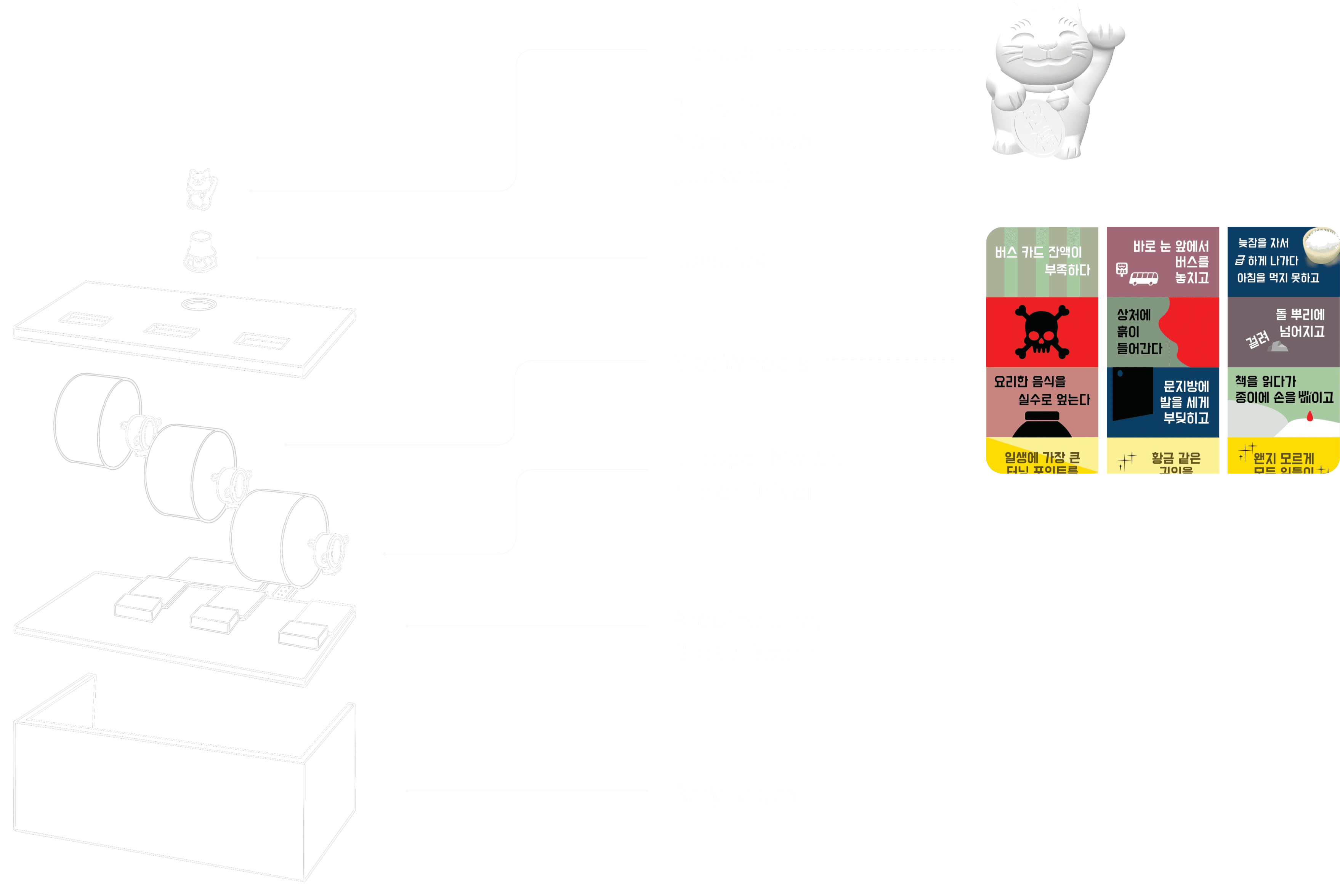 If you look closer, the Lucky Box is built as a simple layered structure. The top holds the user interaction (handle and joystick), the middle contains the reels and stepper motors, and the base houses the Arduino and wiring that drives the motion. To keep the exterior visually minimal, I packed and routed the wiring tightly inside the box so everything stays hidden from view.