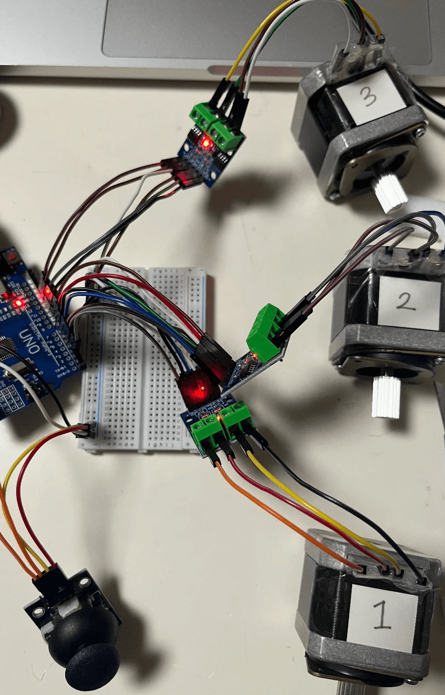 The interaction begins with the user controlling the joystick, directly shaping the motion of the system. Arduino translates the analog input into coordinated motor control, driving the stepper motors in real time. Once the input reaches the target condition, the mechanism automatically aligns to the jackpot position, ensuring a stable and intentional outcome.